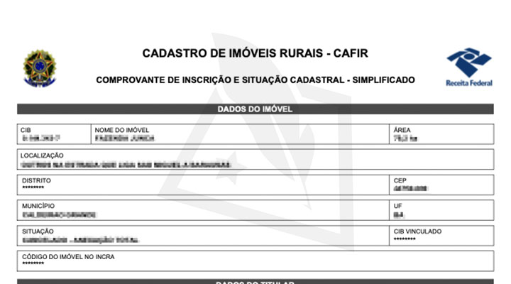 O CAFIR (Cadastro de Imóveis Rurais) é um registro eletrônico mantido pela Receita Federal que contém informações sobre a propriedade rural e sua localização, bem como os dados de seus proprietários.