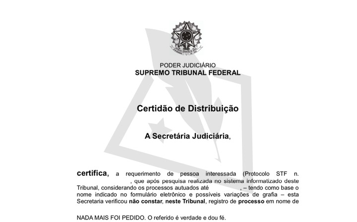 A Cartório Nacional é uma empresa privada que visa buscar qualquer documento, no Brasil inteiro, e que permite que você solicite a sua STF - Certidão Distribuidor, e que ela seja entregue no conforto da sua casa ou escritório. Solicite aqui:
