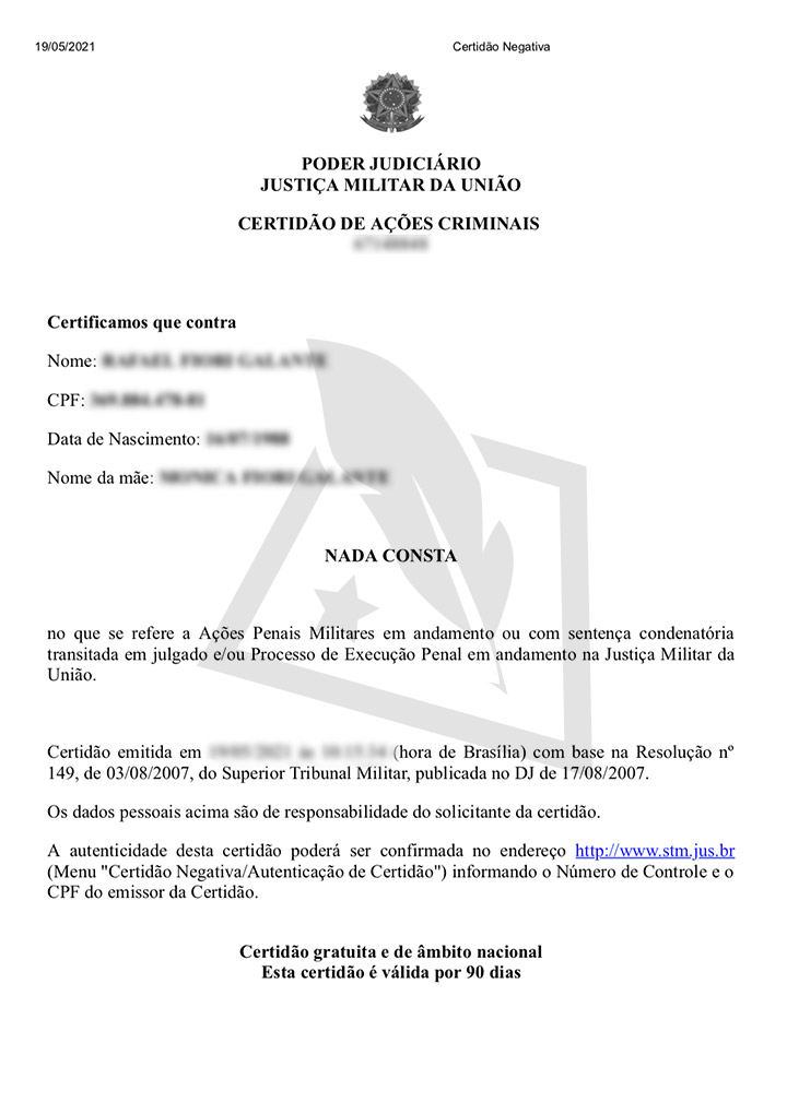 Você deve inserir o CPF. Assim, todas as informações aparecerão em referência a pessoa que tenha associado a seu nome, processos do Tribunal de Justiça. Assim, por meio dessa certidão, se poderá identificar se uma pessoa já foi ou se está sendo incriminada, processada e/ou julgada pela Justiça Militar da União.